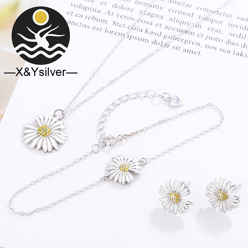 S925 Silver Jewelry Dropping Glue Daisy Necklace European and American Wind Sunflower Bracelet Chrysanthemum Earrings Set Factory Wholesale