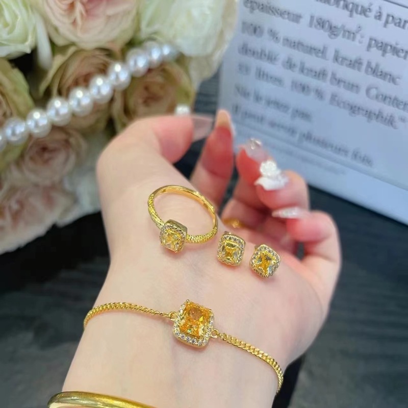 S925 sterling silver small square sugar yellow diamond ring suit bracelet earrings yellow gold citrine gemstone ring adjustable