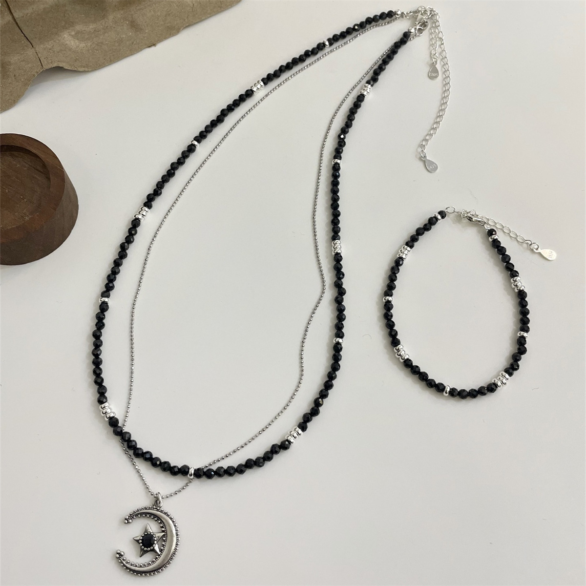 S925 Silver Vintage Star Moon Antique Thai Silver Necklace➕Black Pointy Crystal Necklace Bracelet suit Korean-style Simple High-end Sense