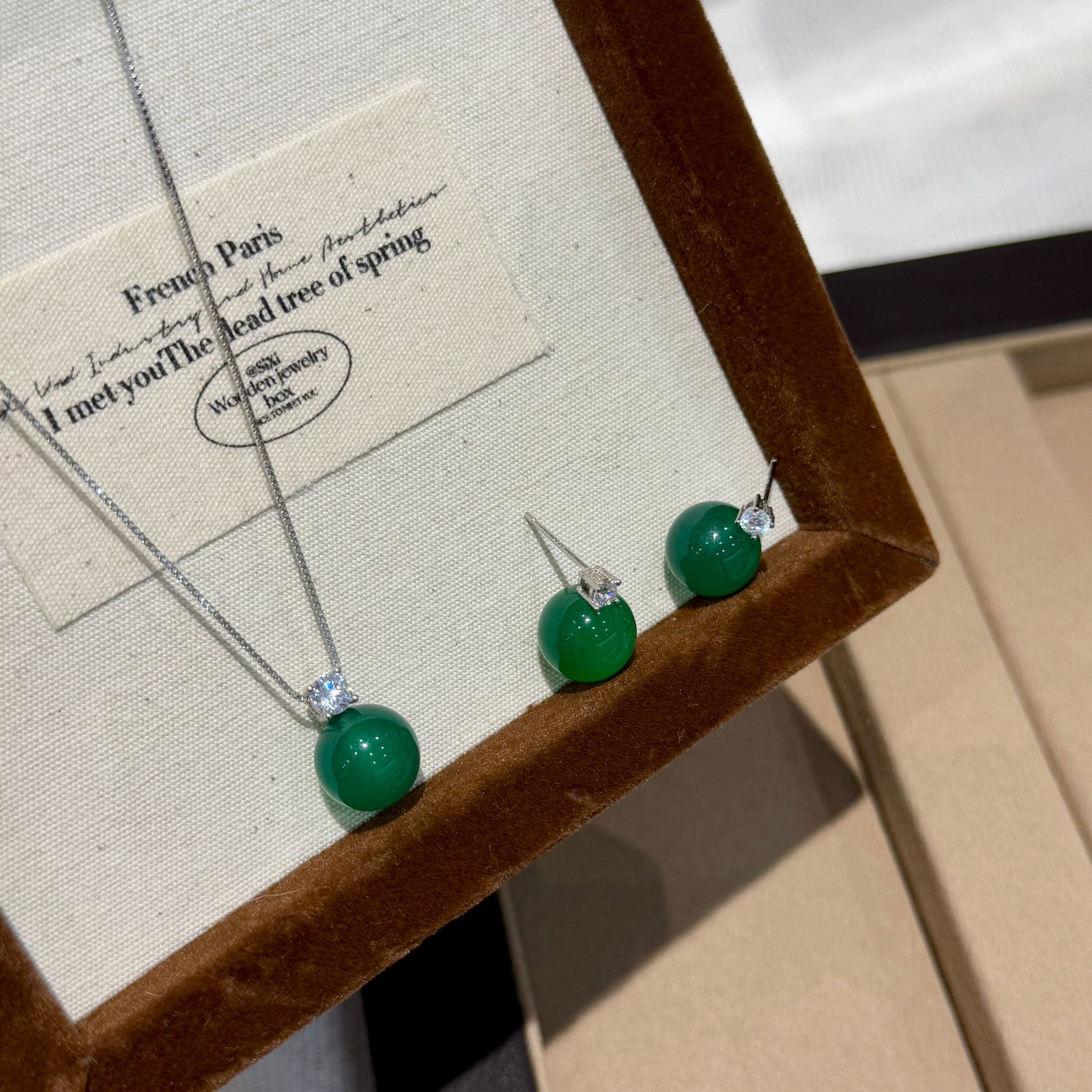 S925 Sterling Silver Natural Green Chalcedony Princess Diana Necklace Accessible Luxury High-End Versatile Niche Design Pendant Earring Set