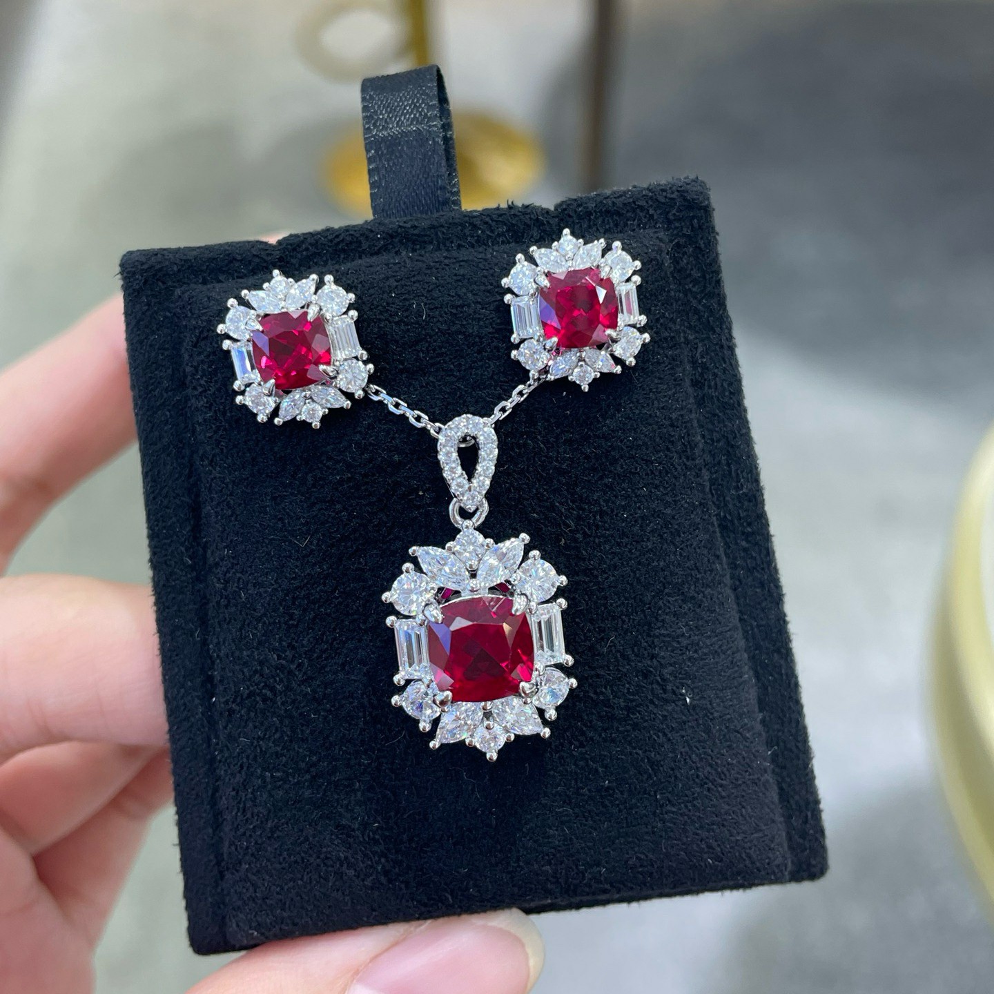 S925 Sterling Silver Pillow-Shaped Cultured Ruby Set, Personalized Luxury and High-End Color Treasure Ring, Pendant and Earring Combination