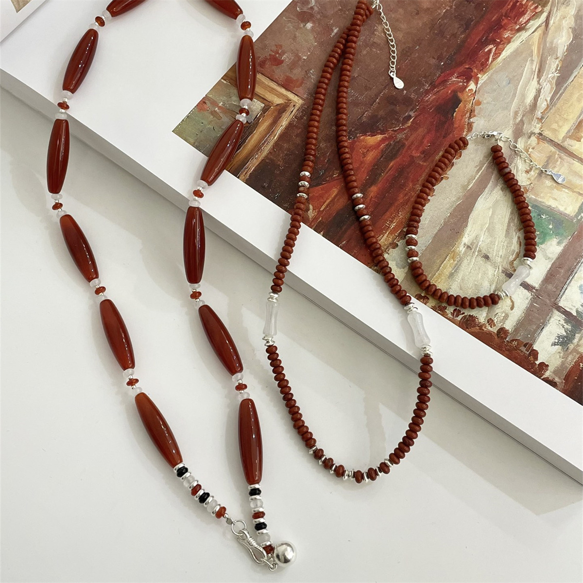 S925 Silver Premium Natural Red Agate Redstone Necklace Bracelet suit Niche Design Temperament Retro Premium