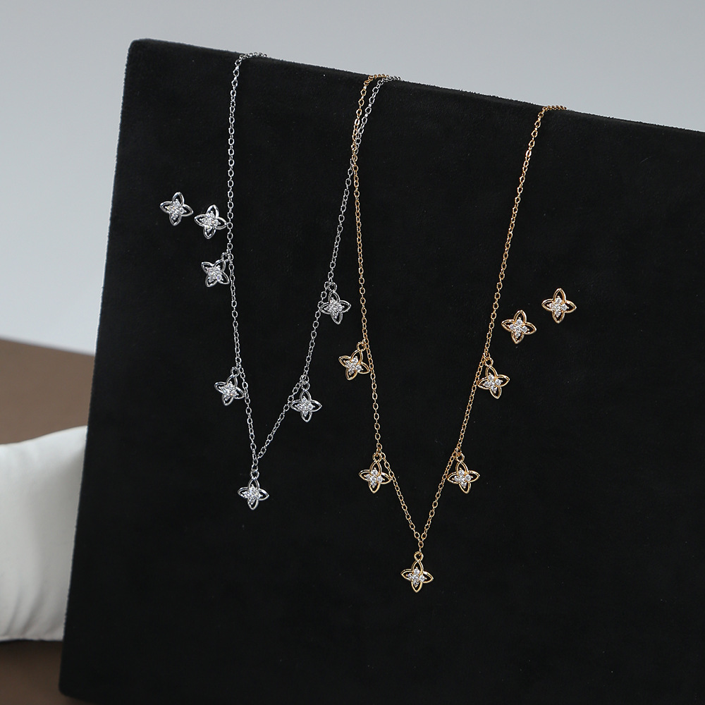Ultra Flash Zircon Inlaid Niche Design Sense Earrings Trendy Flower Earrings Necklace Clavicle Chain Lucky Grass Jewelry Set