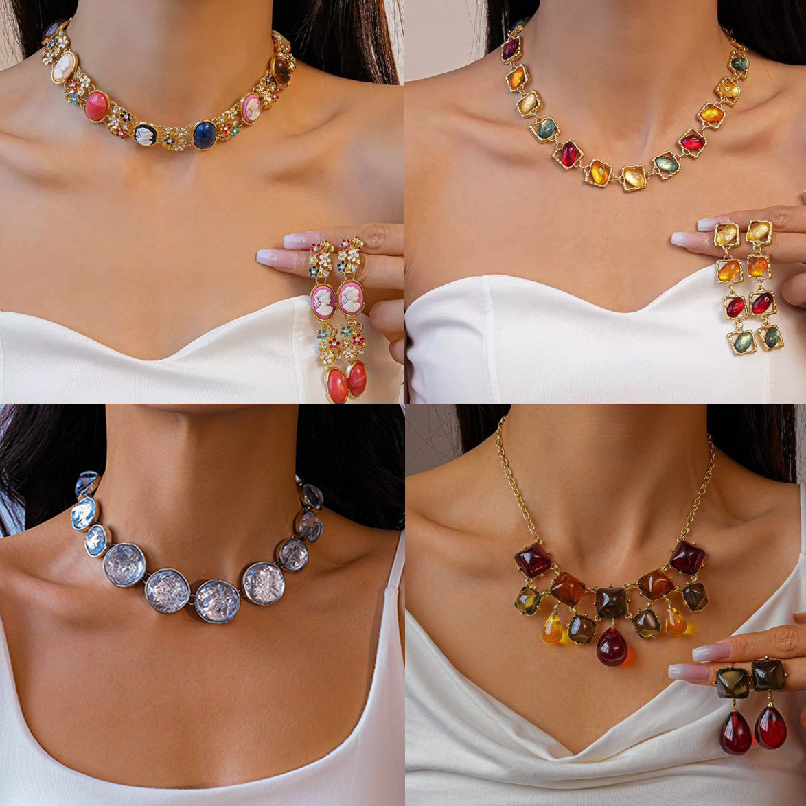 European and American Medieval Style Colorfulful Resin Diamond Earrings Necklace Accessible Luxury High-End Clavicle Chain Fashion Jewelry Set for Women