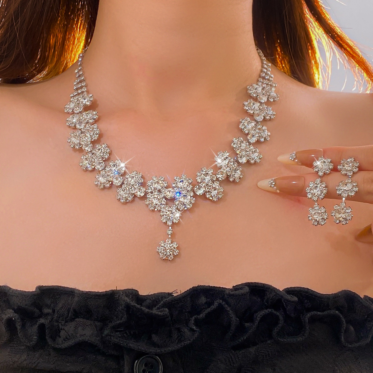 Diamond Flower Multi-Layer Pendant Two-Piece Set of Earrings Necklace Light Luxury Niche Clavicle Chain Fashion Temperament Suit Wholesale