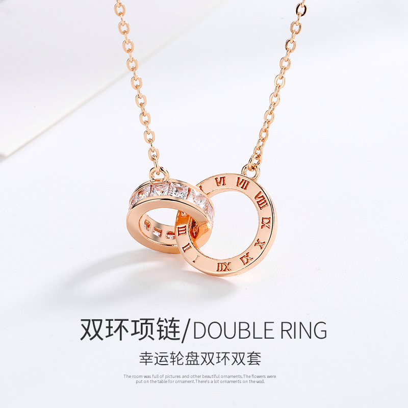 S925 Sterling Silver Double Ring Necklace Women's Roman Numerals Double Circle Pendant Clavicle Chain Rose Gold Bracelet Earring Set
