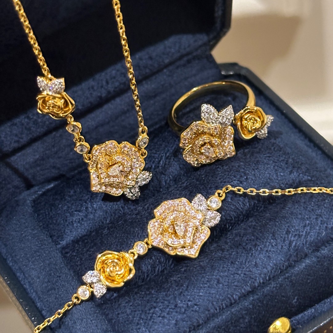 S925 Sterling Silver Niche Accessible Luxury Twin Rose Shape Jewelry Set Bracelet Necklace Ring Women's High-End
