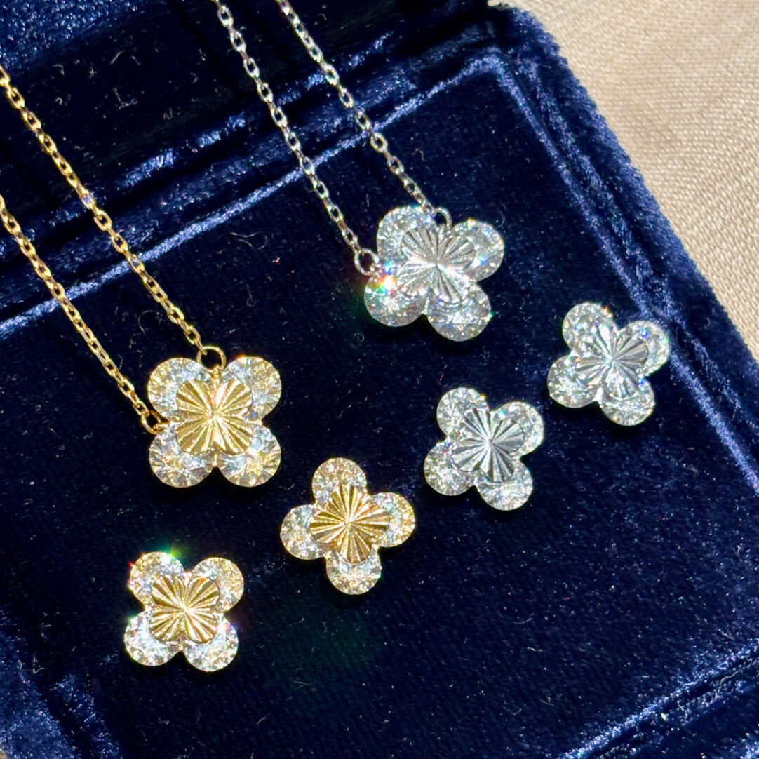 S925 Sterling Silver Four-Leaf Clover Cnc Laser Four-Leaf Clover Earrings Necklace Women's Mid-Century Style Xiaohongshu Hot Style Set