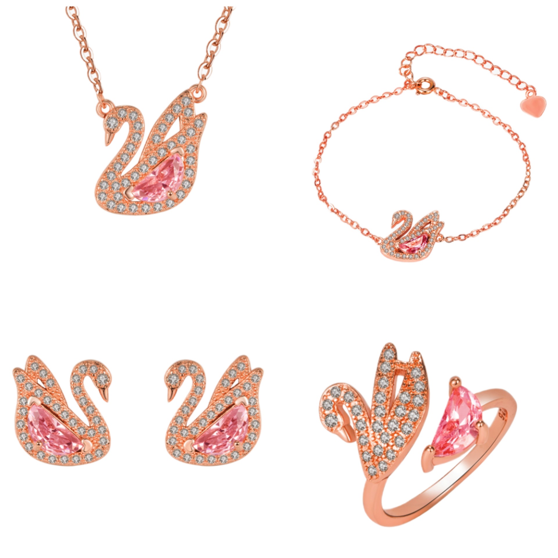 Full Diamond Powder Zircon Swan Set Little Swan Half Moon Pink Crystal Earrings Ring Necklace Bracelet