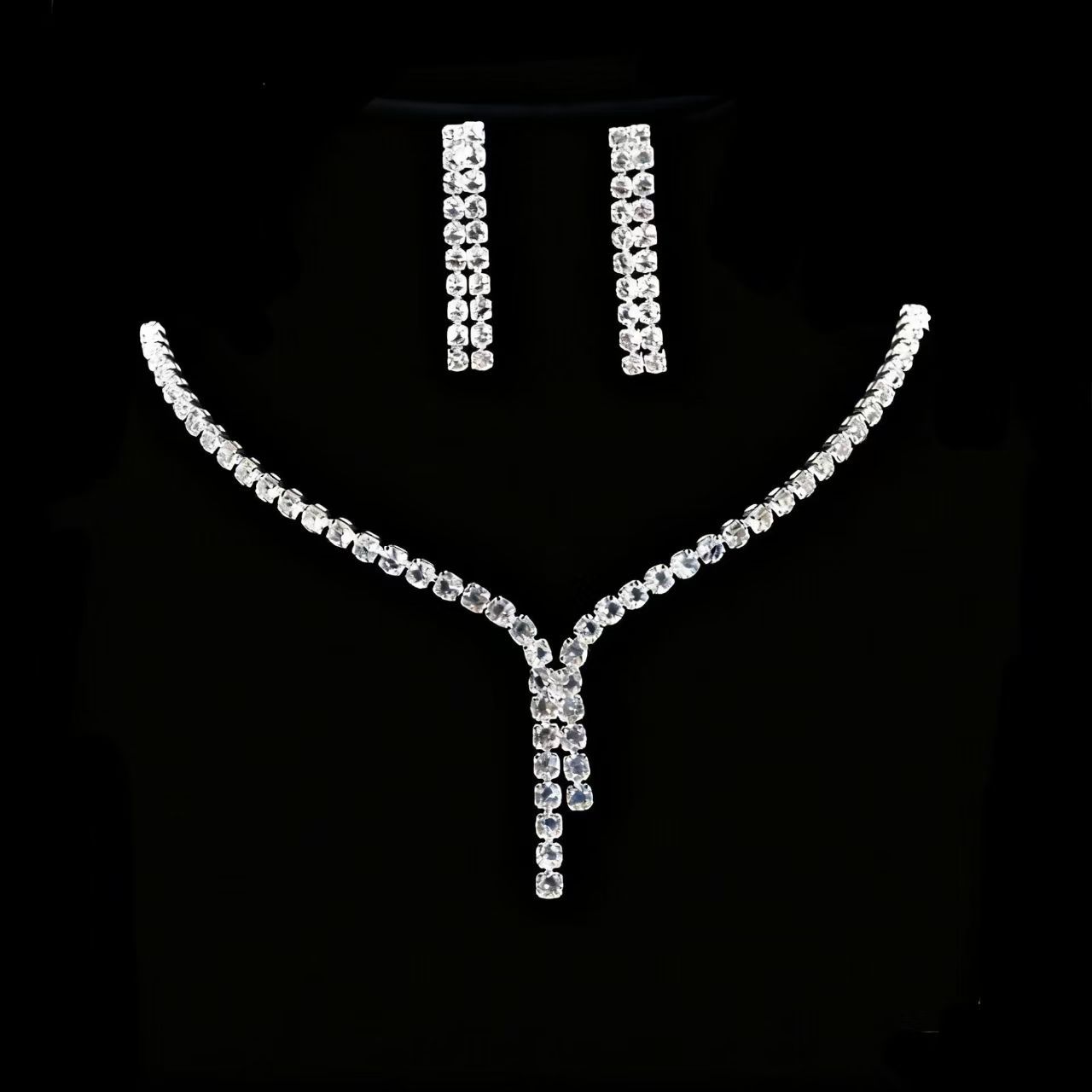 Cross-Border Fashion Dazzling Full Diamond Necklace Women's Fashion Temperament Earrings Set Decoration Niche Simple Two-Piece Set Wholesale