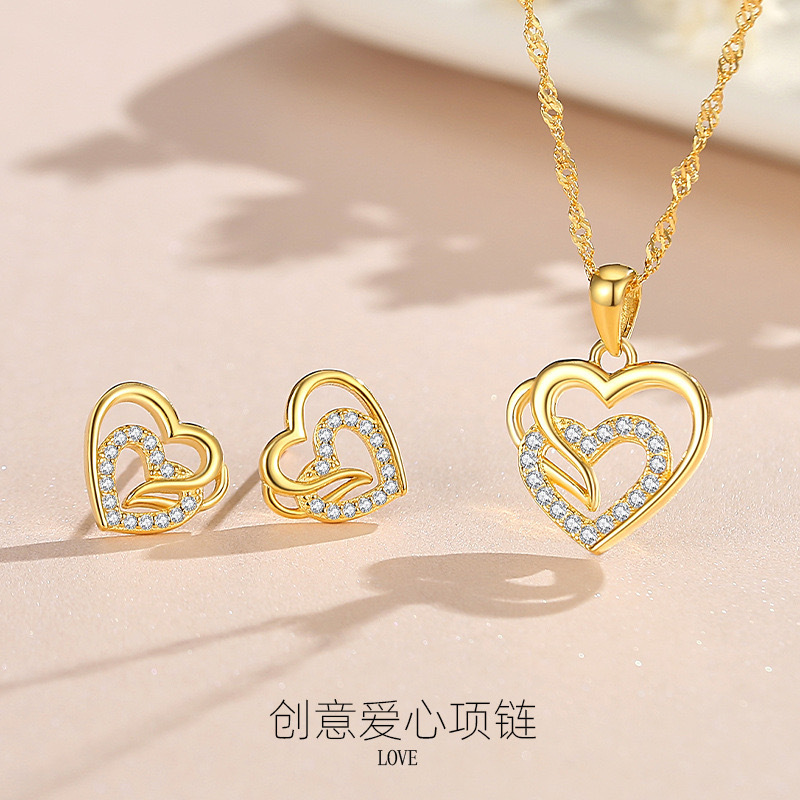 Cross-border Hot S925 Necklace European and American Style Love Double Peach Heart Earrings suit Women's All-match Long-term Color-free First Jewelry
