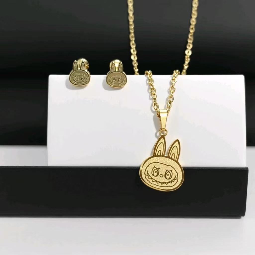 Korean Style New Niche Sweet and Cute Labubu Suit Necklace Earrings Fashionable Stylish Versatile Titanium Steel Earrings