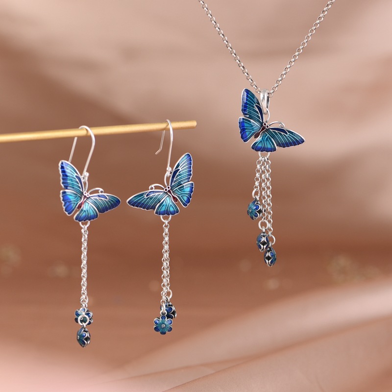 Enamel Color S925 Silver Pendant Artistic Elegant Blue Butterfly Long Tassel Earrings Earrings Necklace Set for Women