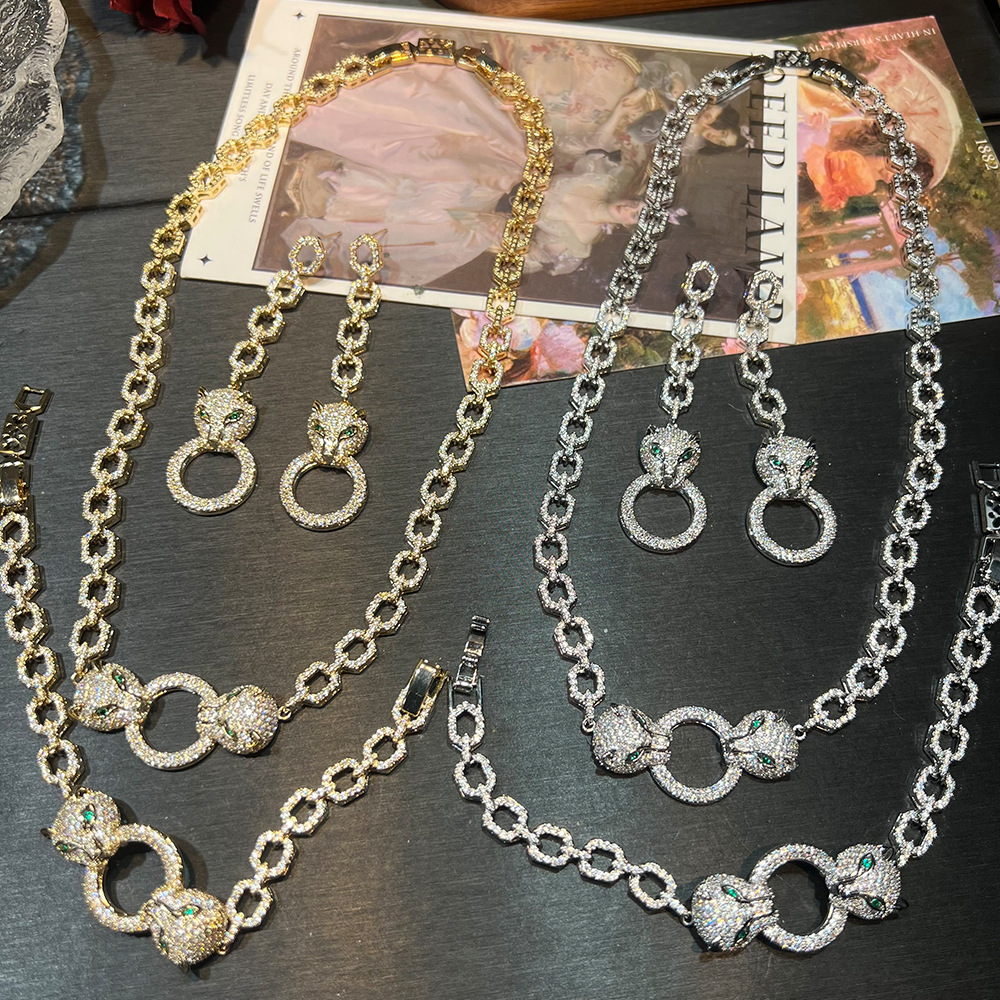 Cuba Chain Leopard Head Heavy Industry Jewelry suit Personalized Fashion Seiko Micro Zirconium Fashion Sweet Cool Necklace Earrings