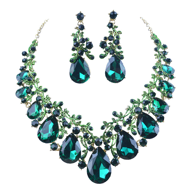 European and American New Fashion Elegant Artificial Gemstone Necklace Earrings Set Women's Alloy Cross-Border Exclusive Clavicle Chain Dance Party
