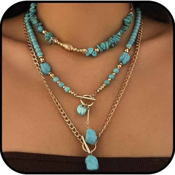 Amazon Cross-Border Retro Imitation Turquoise Bull Head Clavicle Necklace Stacked Beaded Necklace Western Cowboy Style Suit