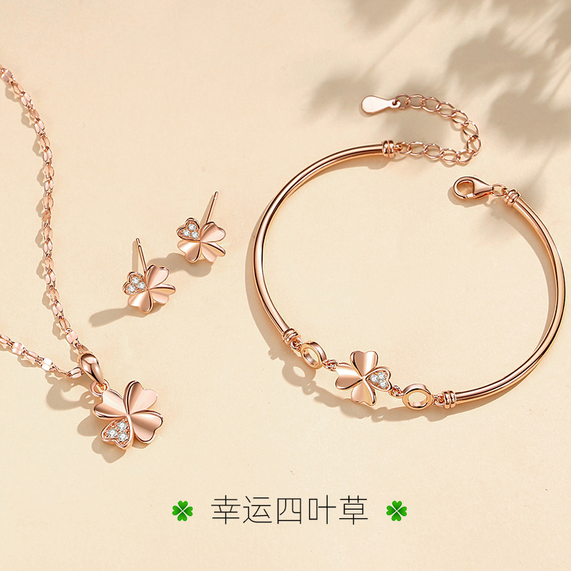 Foot Silver S999 Diamond-encrusted Four-leaf Clover Jewelry suit Light Luxury Style High Version Color-free Zircon Necklace Women's High-end Sense