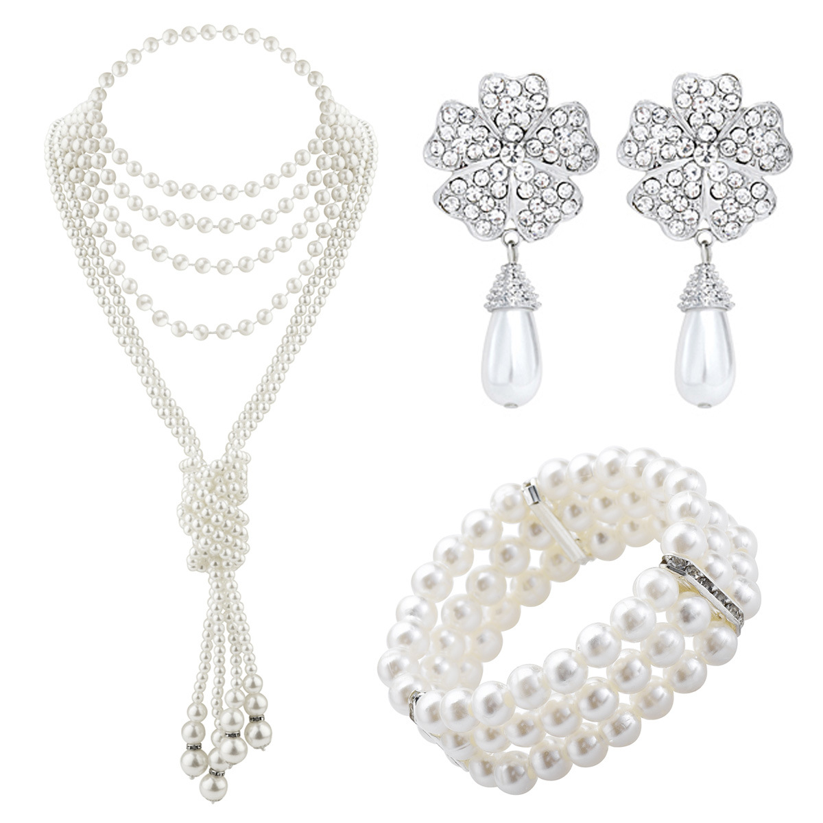 Wedding Party Pearl Bracelet Necklace Earrings Set Great Gatsby Hand Accessories Necklace Earrings Combo