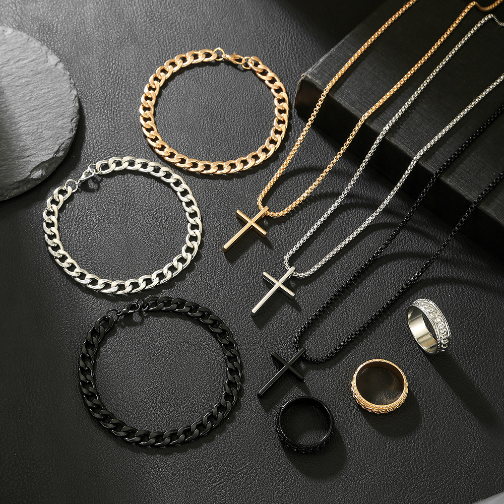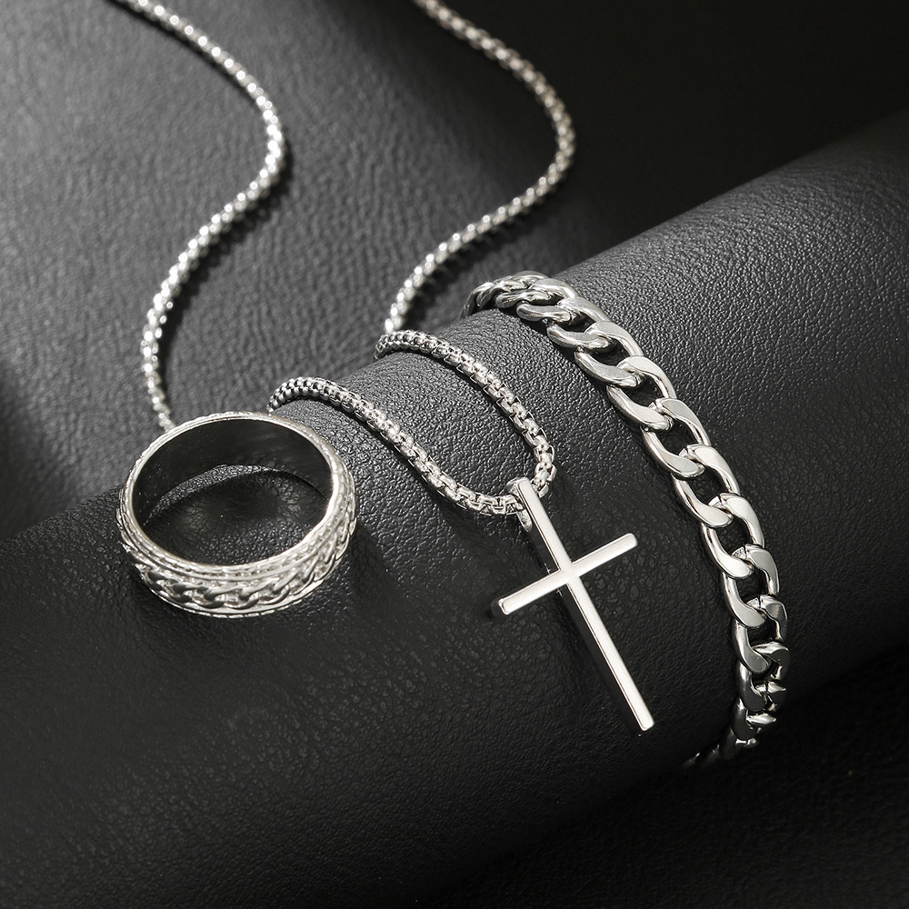 Cross Necklace, Ring, Bracelet Three-Piece Set for Men, Trendy European and American Style, Versatile, Cool, High-End American Sweatshirt Chain