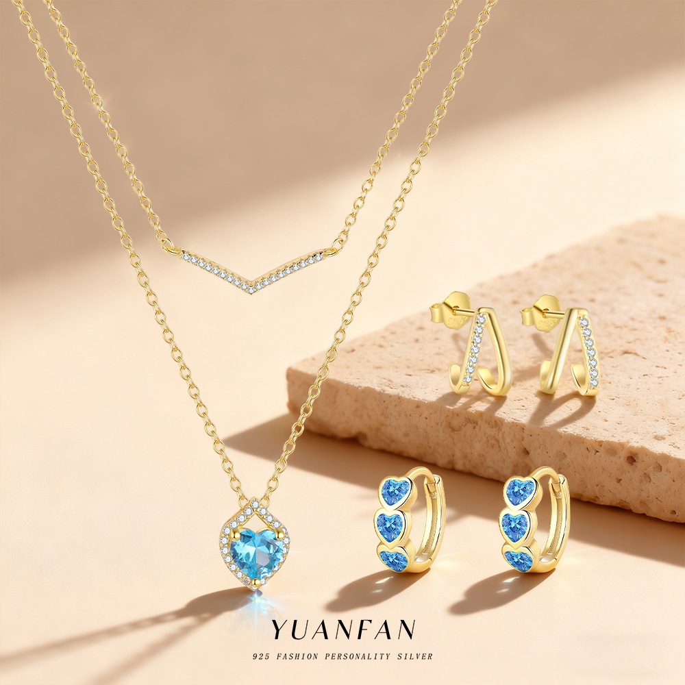 S925 Sterling Silver Sapphire Heart Necklace Women's Stylish Accessible Luxury Simple Wish Bone Clavicle Chain Stacking Jewelry Set