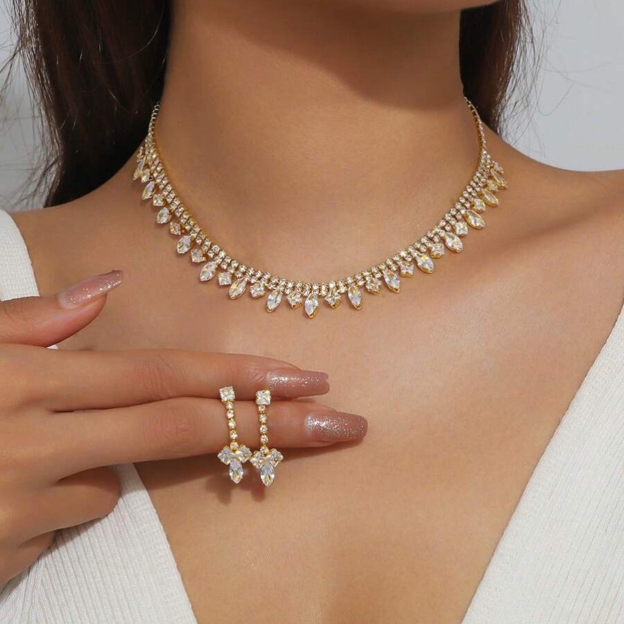 Cross-Border European and American Necklaces, Earrings, Bracelets, Jewelry Sets, Bridal New Zircon Three-Piece Set, Fashionable Full Diamond Jewelry