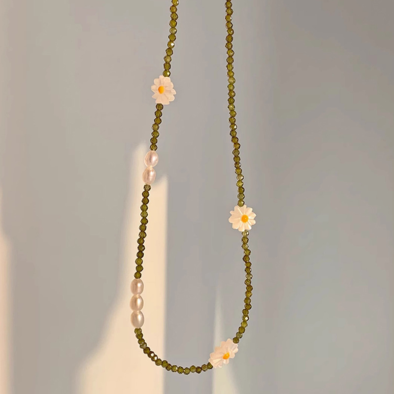 S925 Silver Green Zircon Daisy Freshwater Pearl Beaded Necklace Pastoral Spring Fresh and Versatile Girly Set