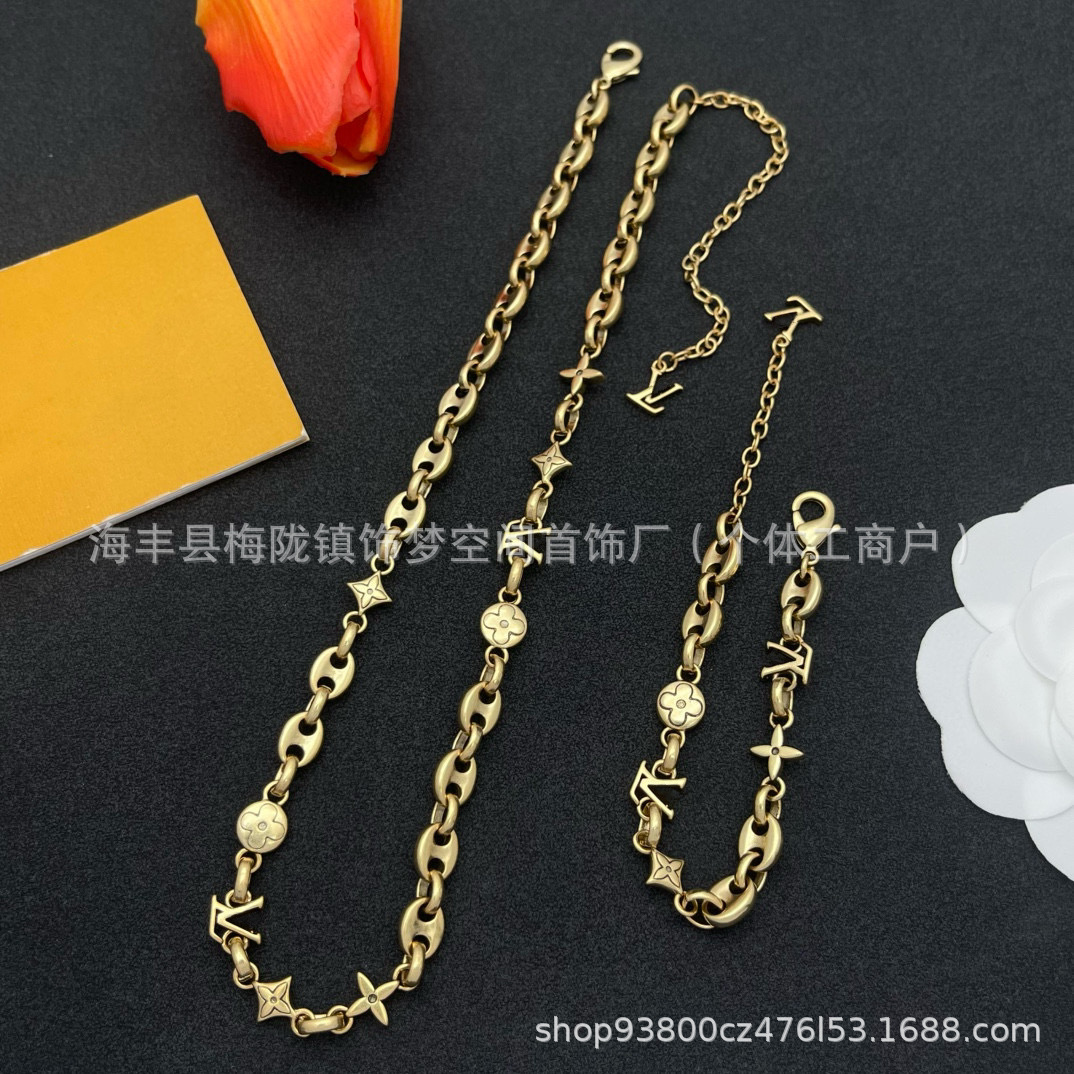 Wholesale Asian Gold Jewelry Letter Four-Leaf Flower Necklace Couple Men's Necklace Brass Carved Bracelet Set Wholesale