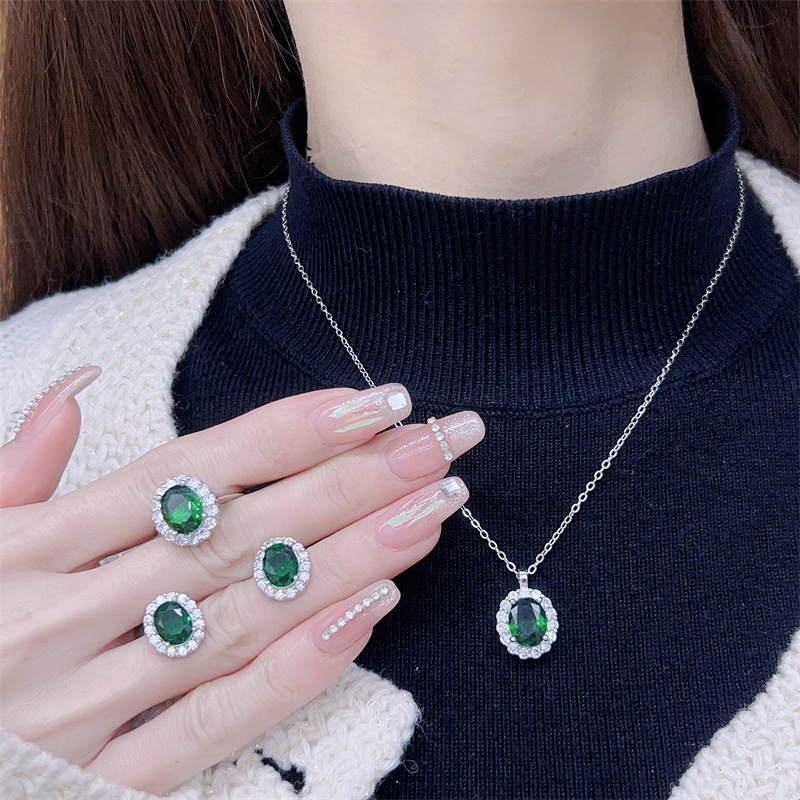 Necklace Clavicle Emerald Chain Sterling Silver Gem Pendant Jewelry Inlaid Zircon Green Women's High-end Jewelry suit