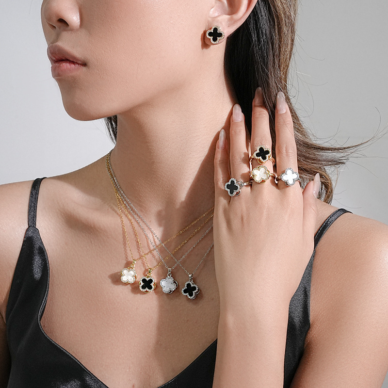 [Set] Full Diamond Double-Sided Four-Leaf Clover Necklace for Women, Fashionable, Simple and Versatile, High-End Accessible Luxury Titanium Steel Jewelry Wholesale
