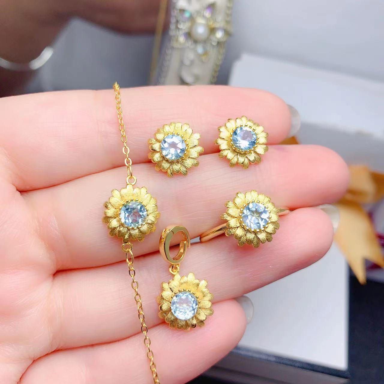 Factory Direct Sales Wholesale Colorful Treasure Jewelry 925 Silver Inlaid Natural Sky Blue Topaz Round Daisy Set