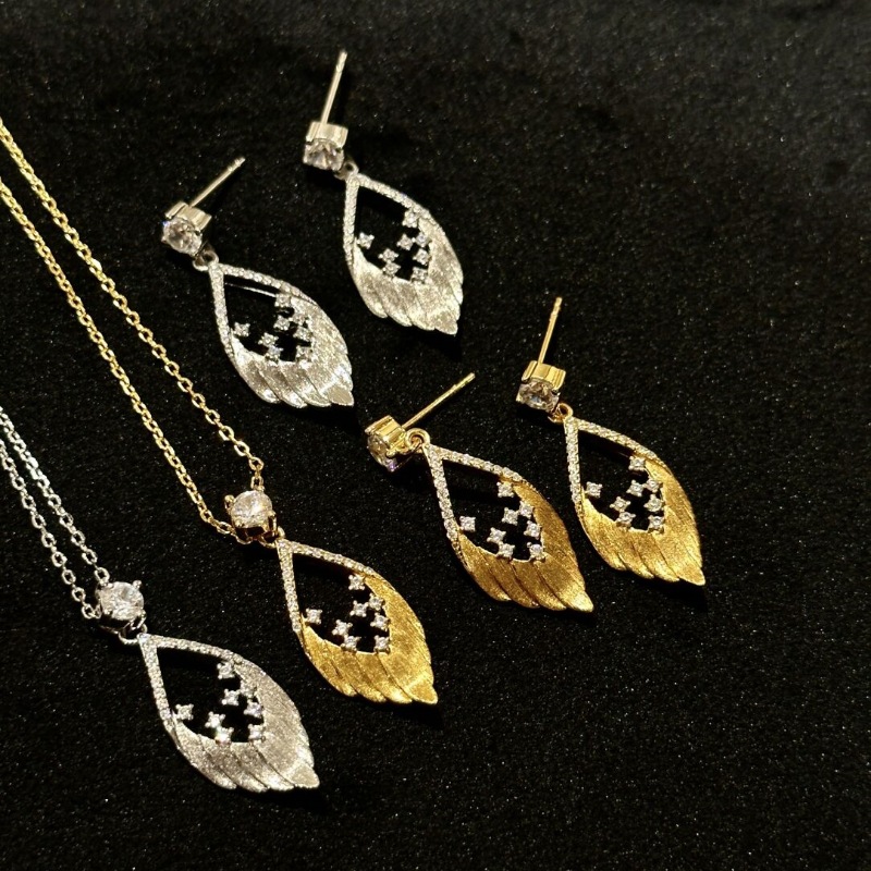 Vintage Mid-Century Style Diamond Brushed Feather Necklace Earrings Sparkling Exquisite Fashion Niche Design Set