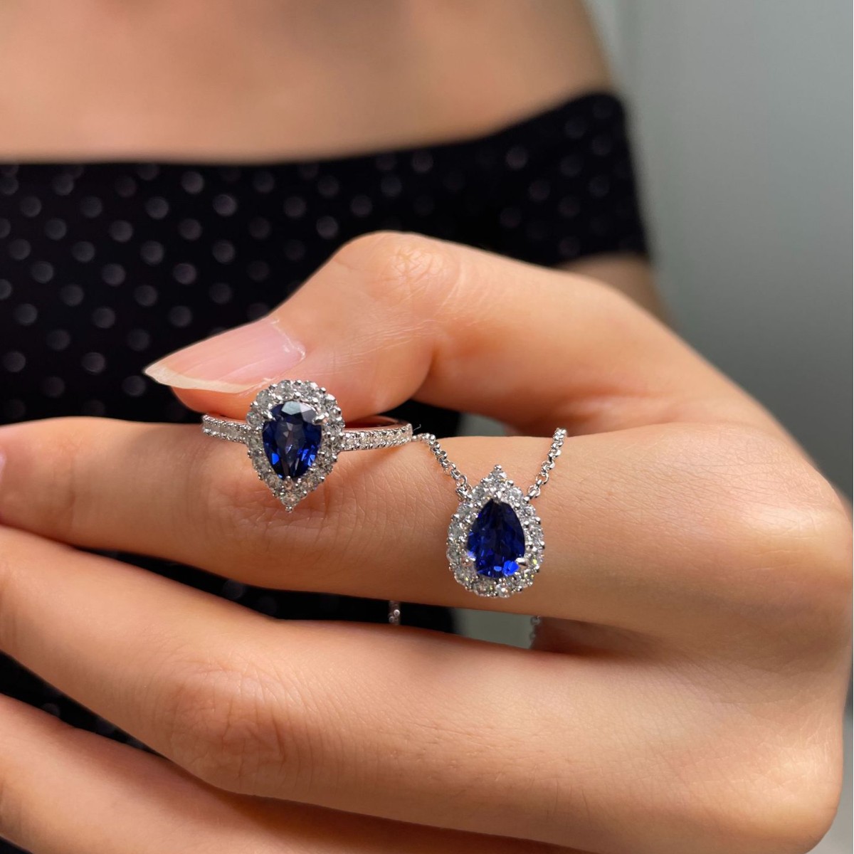 1 Carat Water Drop Blue Tears Cultured Sapphire Necklace + Ring S925 Silver Fine Inlaid Elegant Versatile Work Clothing Suit