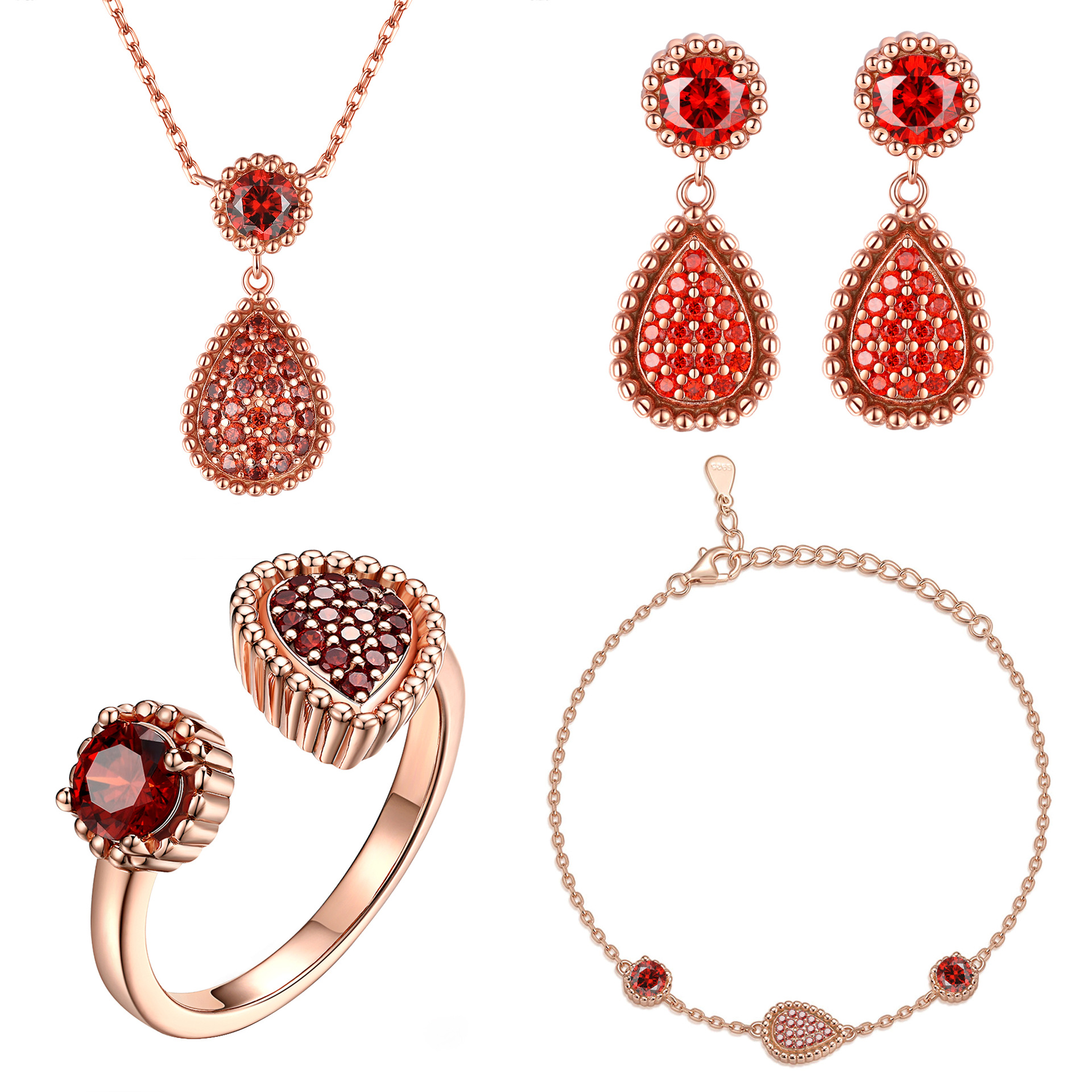 S925 sterling silver jewelry suit 4-piece set high-grade European and American rose gold stud earrings water drop open ring necklace ins