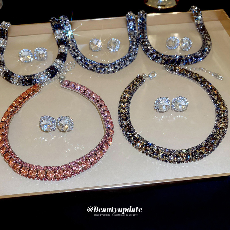 New European and American Jewelry suit Women Fashion Temperament Personalized Rhinestone Zircon Necklace Earrings Ring Watch Accessories