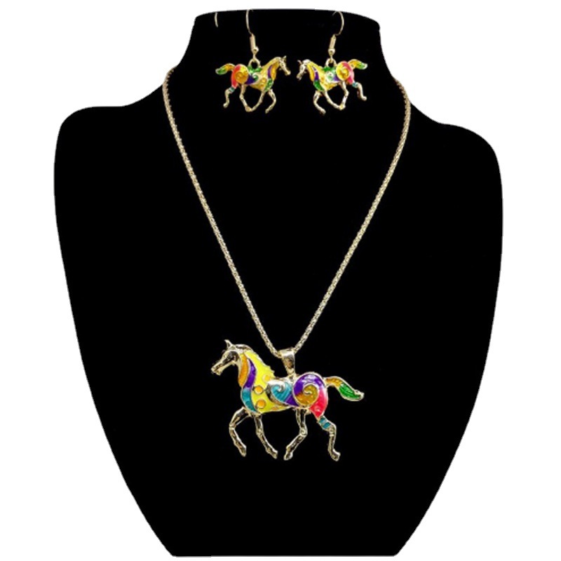 Spring and Summer new jewelry European and American fashion dripping rainbow horse suit color necklace earrings two-piece set for women