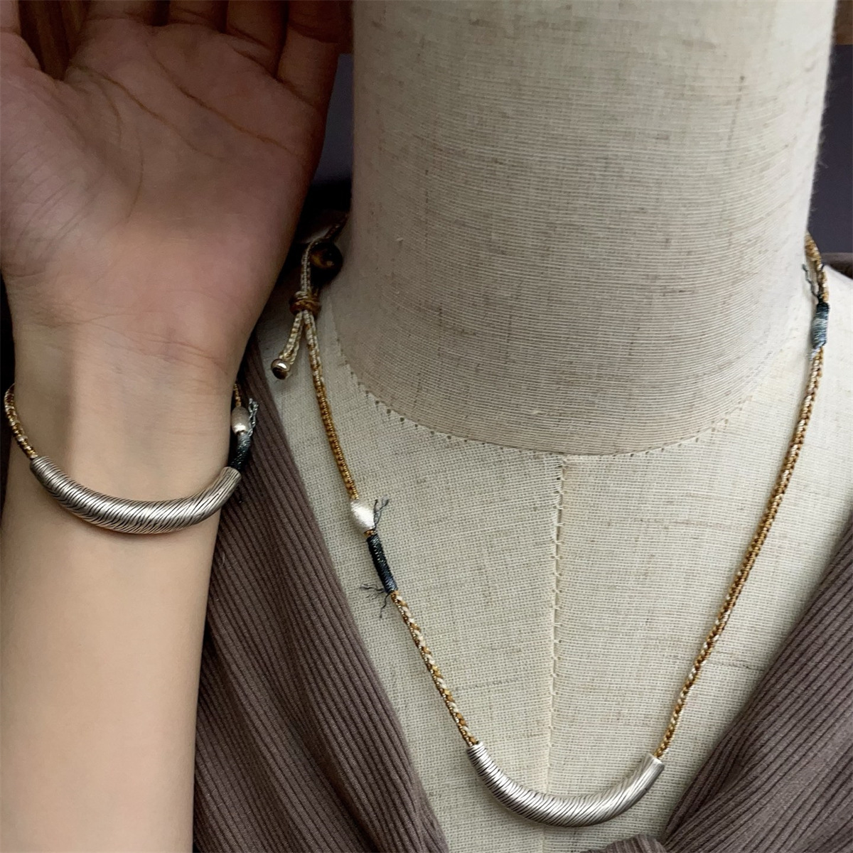S925 Silver ➕ 999 Pure Silver Stripesd Silver Tube Braided Rope Necklace Bracelet Set Niche Design Retro High-End Sense