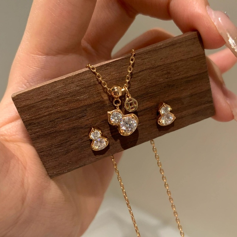 Light Luxury Retro New Chinoiserie Double Diamond Gourd Earrings Necklace Fulu Whitening Fashion Sense Versatile Exquisite Elegant Set
