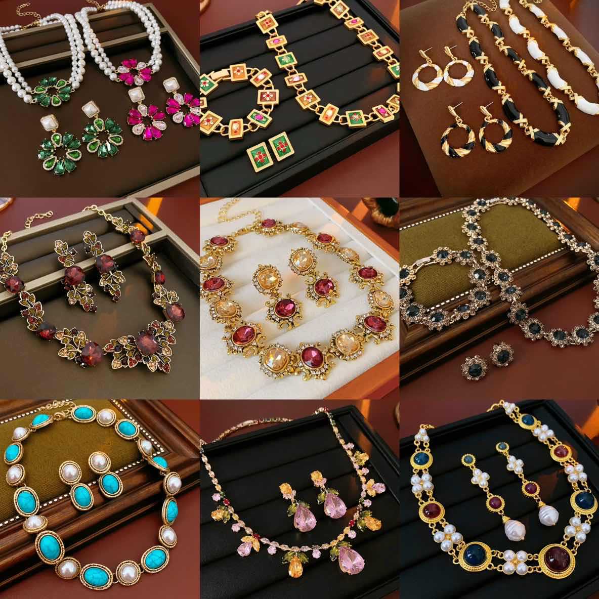 Cross-border European and American-style two-piece jewelry versatile necklace suit exaggerated retro alloy rhinestone earrings necklace women