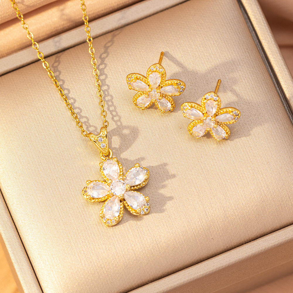 [Set] Cross-Border Popular Copper Inlaid Zirconium Flower Necklace Women's Earrings Accessible Luxury Elegant Stainless Steel Sweater Chain Jewelry