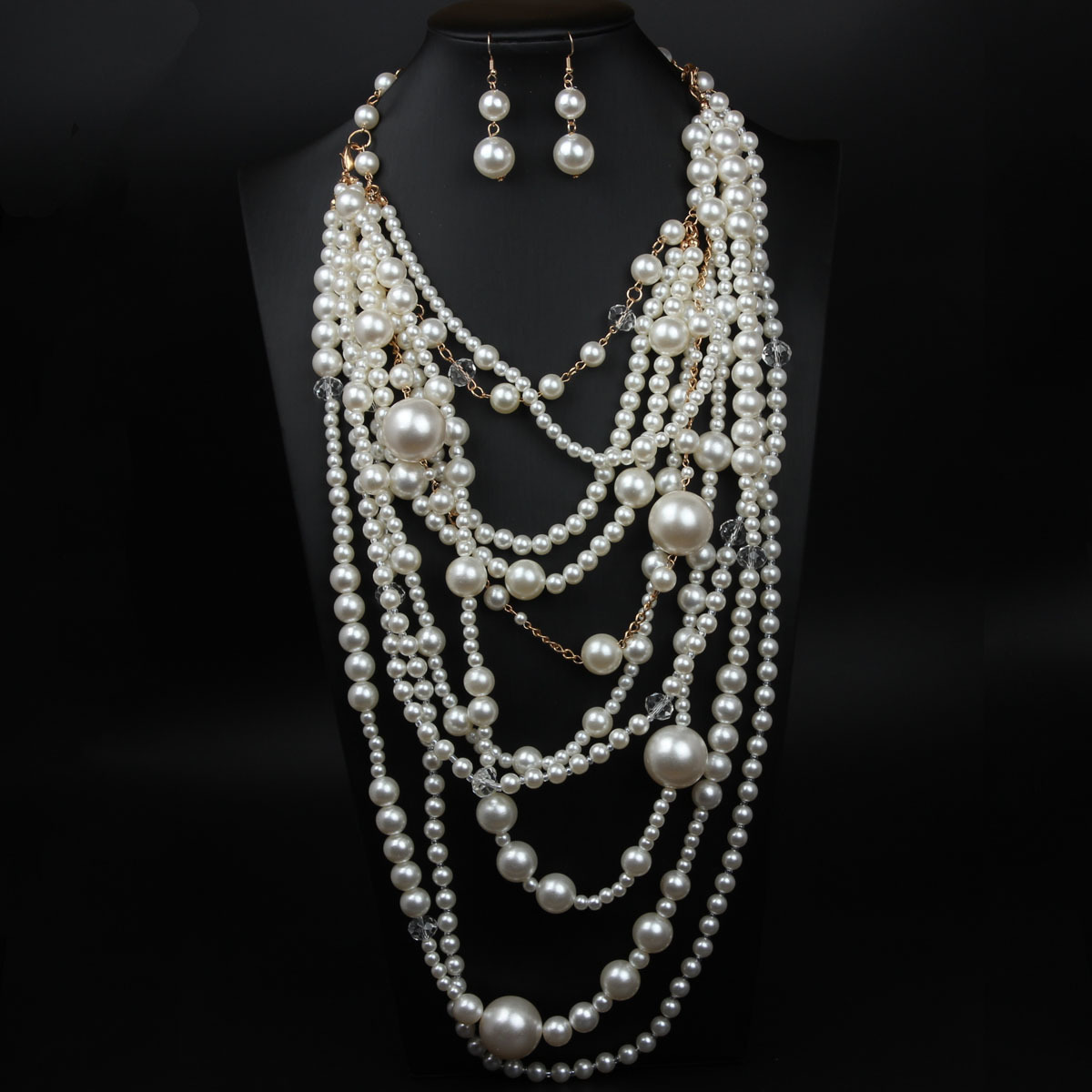 Cross-Border European and American Fashion Exaggerated Multi-Layered Pearl Necklace Set Earrings Versatile Sweater Chain Women's Accessories Wholesale