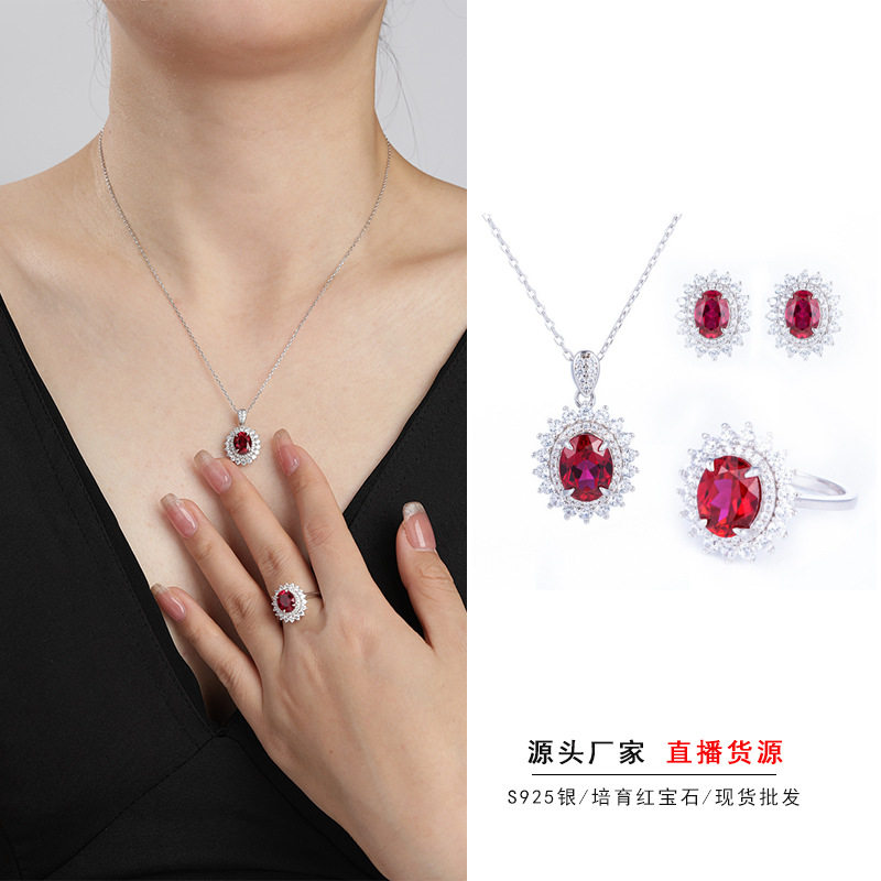 Diamond Jewelry European and American Fashion Cultivation Ruby S925 Silver Plated 18k Jewelry Three-Piece Necklace Ring Earrings