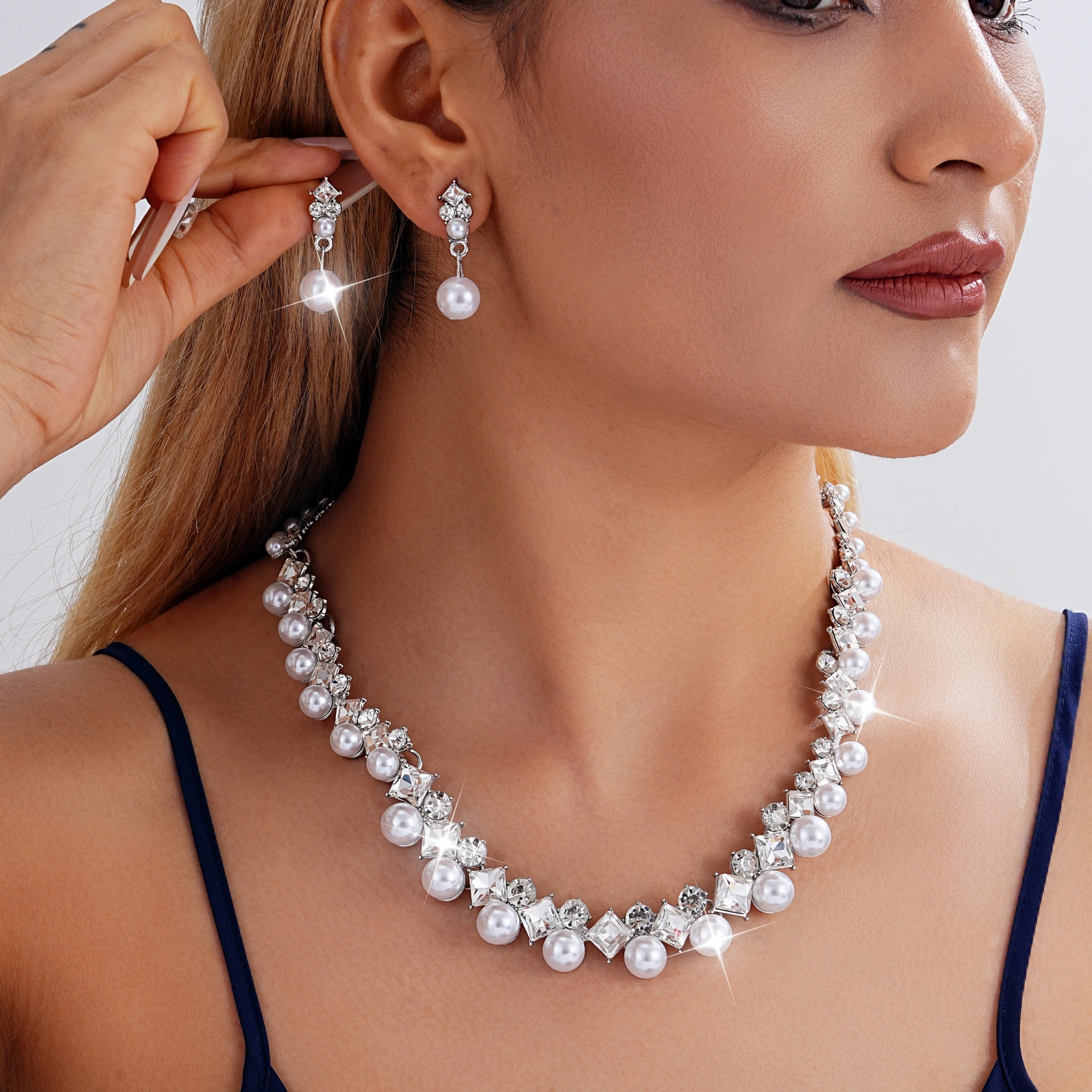 Diamond-Encrusted Geometric Pearl Beaded Necklace, Accessible Luxury Design, Multi-Layered Necklace, Sense of Design and High-End Jewelry Set for Women