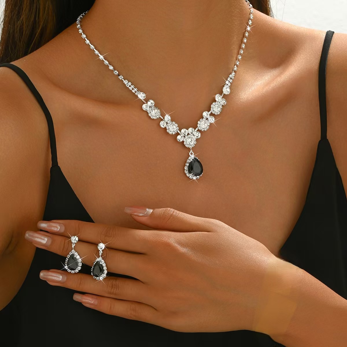 Diamond-encrusted water drop tassel necklace earrings suit European and American exaggerated atmospheric clavicle chain light luxury high-end jewelry wholesale