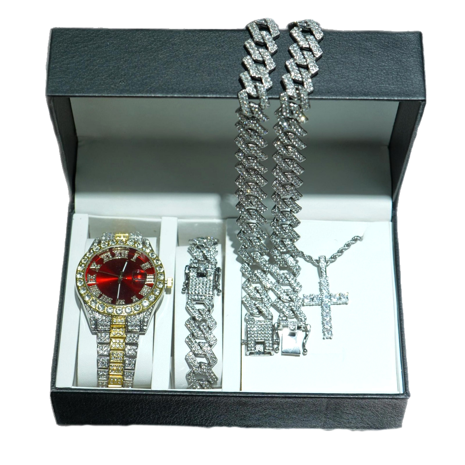 European and American Fashion Versatile Zinc Alloy Cross Necklace Diamond-Shaped Cuban Necklace Bracelet Men's Diver Watch Set