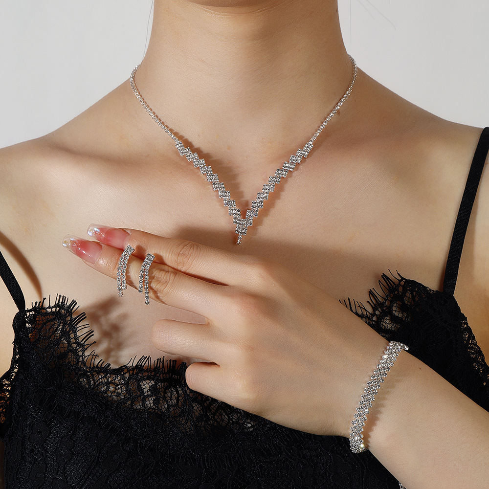 Spring and Summer New Simple Temperament Full Diamond Claw Chain Jewelry suit Women's Diamond Tassel Necklace Earrings Bracelet Jewelry