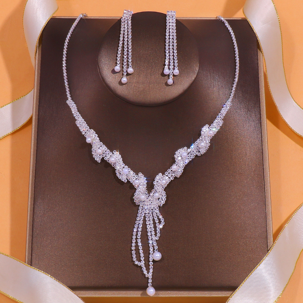 New Rhinestone Pearl Necklace and Earring Set, Simple Bridal Tassel Jewelry Set Accessories