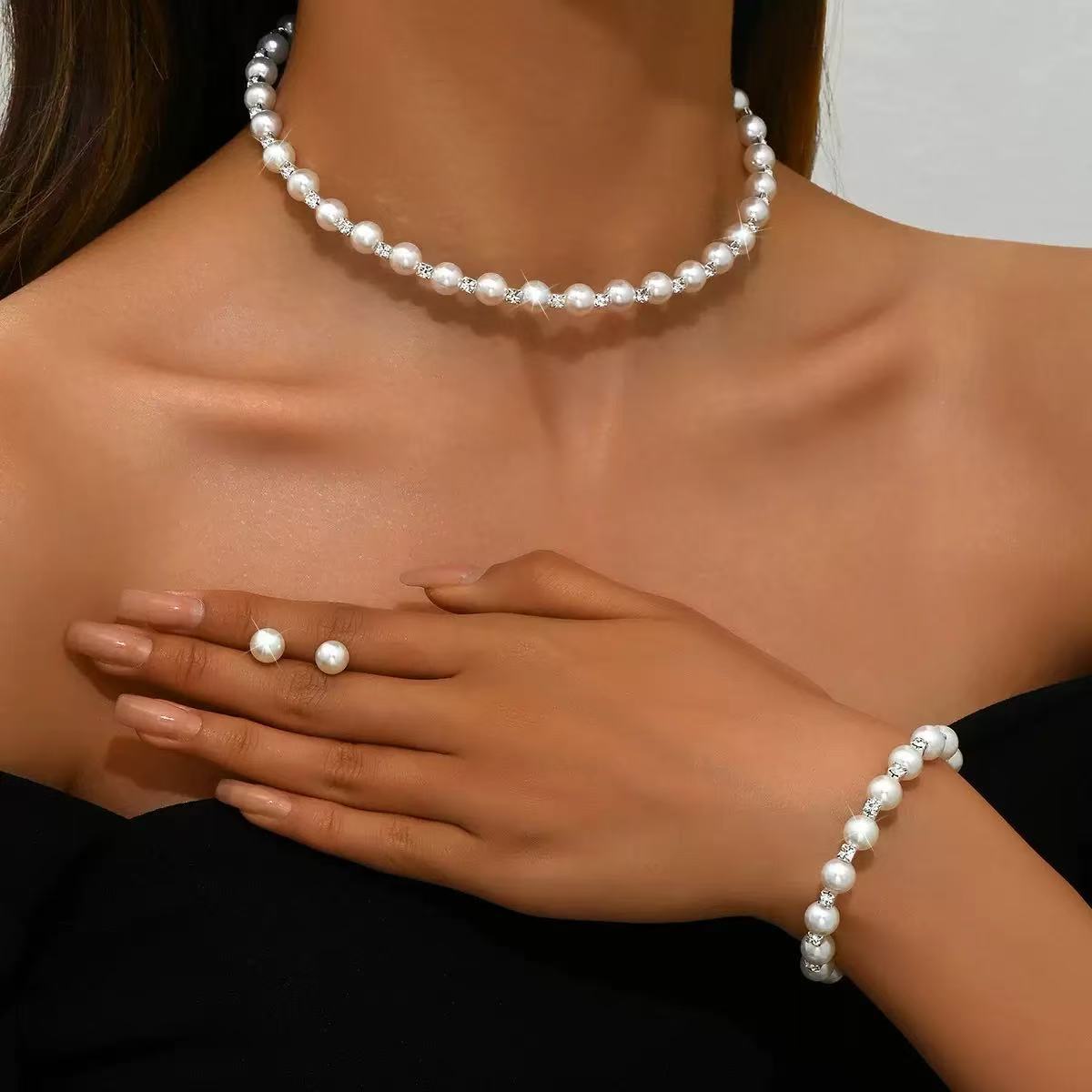 2025 New European and American High-End Pearl Jewelry Set Bridal New Imitation Pearl Necklace Earrings Bracelet Set