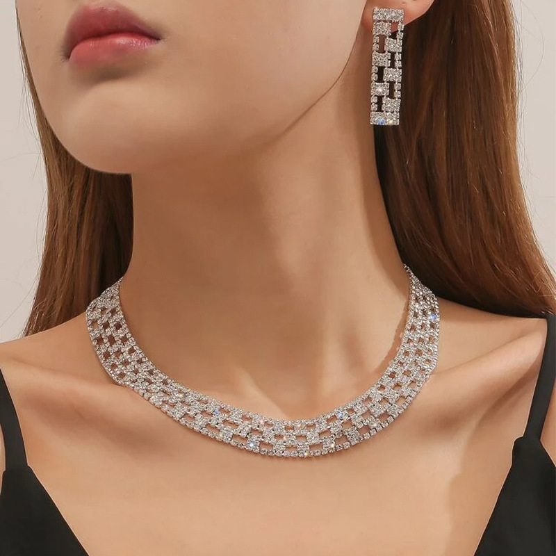 AliExpress cross-border hot selling jewelry hollow necklace set rhinestone luxury European and American popular high-end banquet accessories for women
