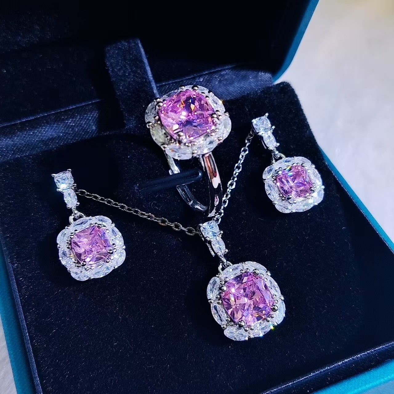 Fashion Colored Gemstone High Carbon Diamond Square Bag Jewelry Three-Piece Set Imitation Pink Diamond Yellow Diamond Ring Pendant Earrings Necklace Set