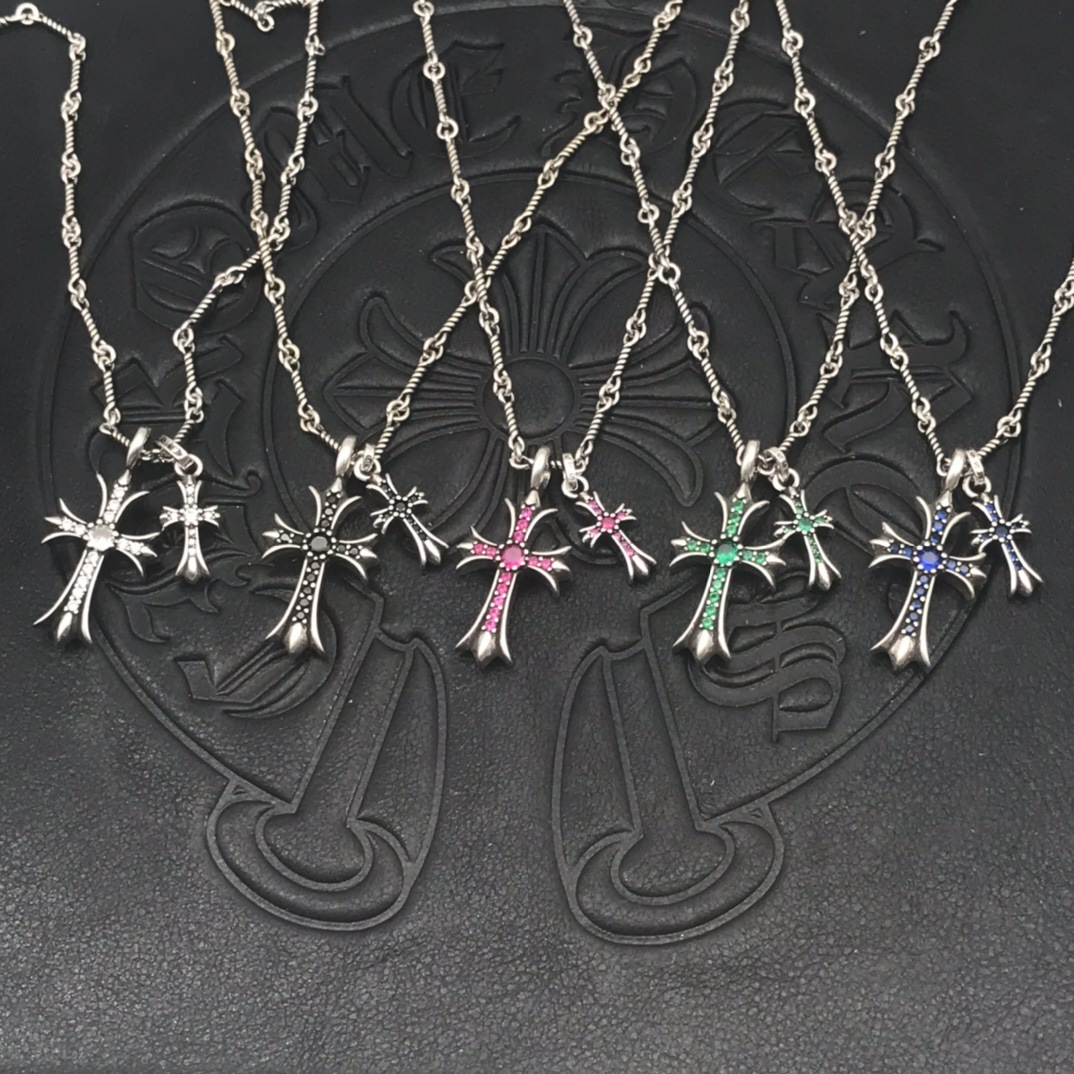 Trendy Accessories Thai Silver Retro Distressed Diamond-Encrusted Large and Small Double Cross Necklace Sweater Chain High-End Autumn and Winter Jewelry